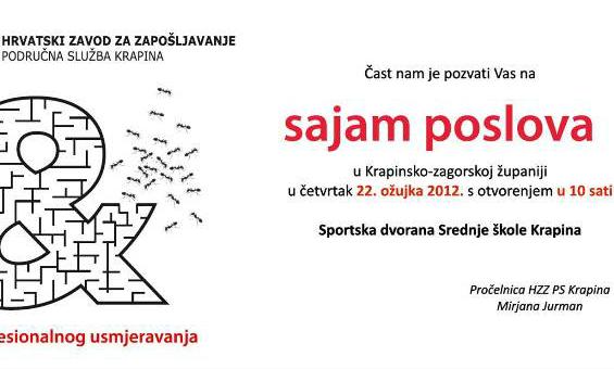 Hrvatski zavod za zapošljavanje – Područna služba Krapina pod pokroviteljstvom Krapinsko-zagorske županije i Grada Krapine u suradnji s partnerima organizira Sajam poslova i Dan profesionalnog usmjeravanja Krapinsko-zagorske županije dana 22.03.2012. (četvrtak) u Krapini, Sportska dvorana Srednje škole Krapina, od 10:00 do 15:30 sati.