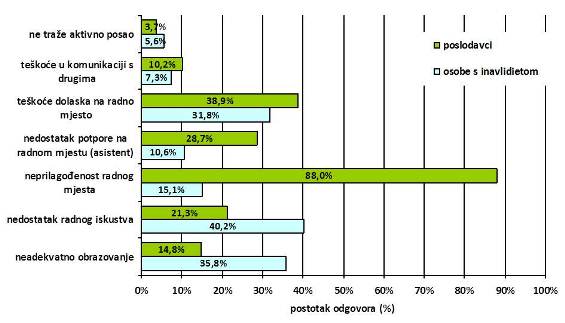 Podaci pokazuju da su anketirane osobe s invaliditetom većinom osobe s završenom trogodišnjom školom (68,6%), ali najčešće pomoćnih zvanja, u najvećem broju ne posjeduju dodatna znanja i vještina, te su dugotrajno nezaposlene (62,1%). U cilju traženja posla OSI najčešće pribjegavaju pasivnijim oblicima traženja posla poput pregledavanja oglasa u HZZ i novinama, a nešto manje putem direktnih kontakata s poslodavcima. OSI u najvećem broju smatraju da bi im povećalo zapošljivost i mogućnosti zapošljavanja stjecanje novih znanja i vještina, a zatim otvoreniji i spremniji poslodavci na zapošljavanja osoba s invaliditetom. Tek nekolicina  poslodavaca (12,0%) je do sada zapošljavalo osobe s invaliditetom, a 40,0% iskazuje interes za njihovo zapošljavanje. Postoje razlike među poslodavcima i OSI u percipiranim razlozima nezaposlenosti OSI što može proizlaziti iz nedovoljnog poznavanja mogućnosti osoba s invaliditetom od strane poslodavaca, odnosno nedovoljno poznavanje zahtjeva radnih mjesta od strane osoba s invaliditetom.